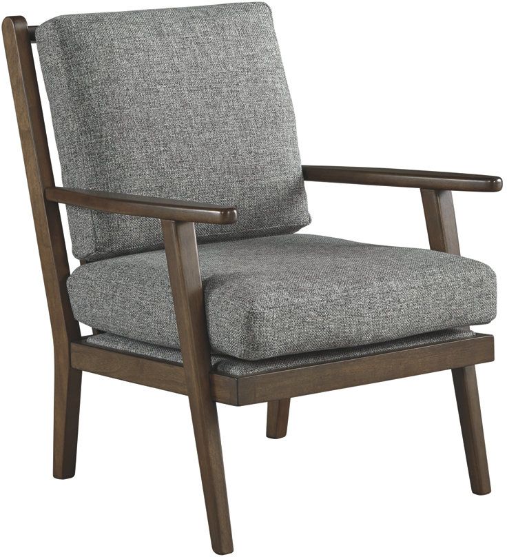 There is no doubt about it, this chair is everything you could ever want in an accent chair. Clean lines, slat-back, timeless upholstery, and a mid-century design that never goes out of style. Find the perfect fit for your contemporary taste and high-fashion living room. The accent chair owes its elevated presence to its tapered legs and coffee-tone finish that beautifully complements the plush charcoal cushions. Discover elegance and endless charm with the Zardoni accent chair from Ashley®.
