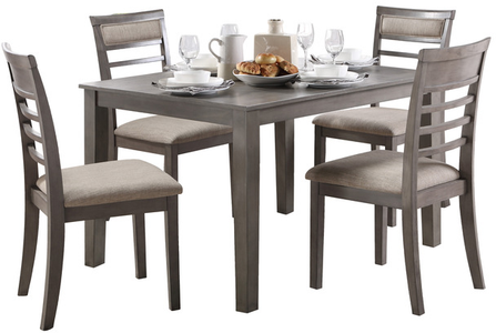 The Ashridge Set features an oak veneer, a beautiful gray finish, and wood framed side chairs with brown fabric-covered padded seats and upper seat backs. The transitional styling will lend perfect accent to your casual dining space.Read More
