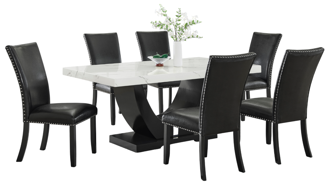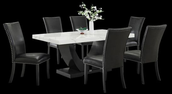 The beautiful white marble top table features one-piece veneer construction for a seamless look that is sure to please. The nailhead trim polyurethane chairs are easy-to-clean and add a touch of glamour to any room.Read More