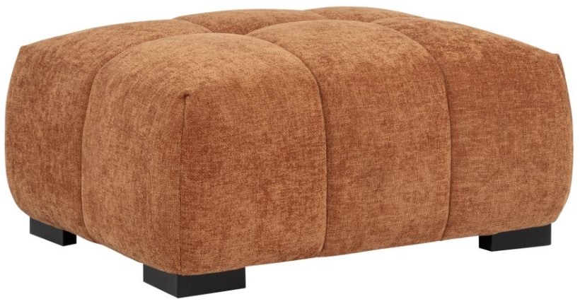Ottoman in orange fabric showcases sculptural volume and plush vertical grid tufting