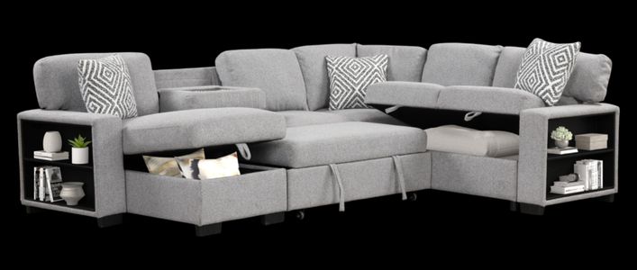 Loveseat with storage, loveseat pullout. Drop down table. Wedge in a grey fabric.