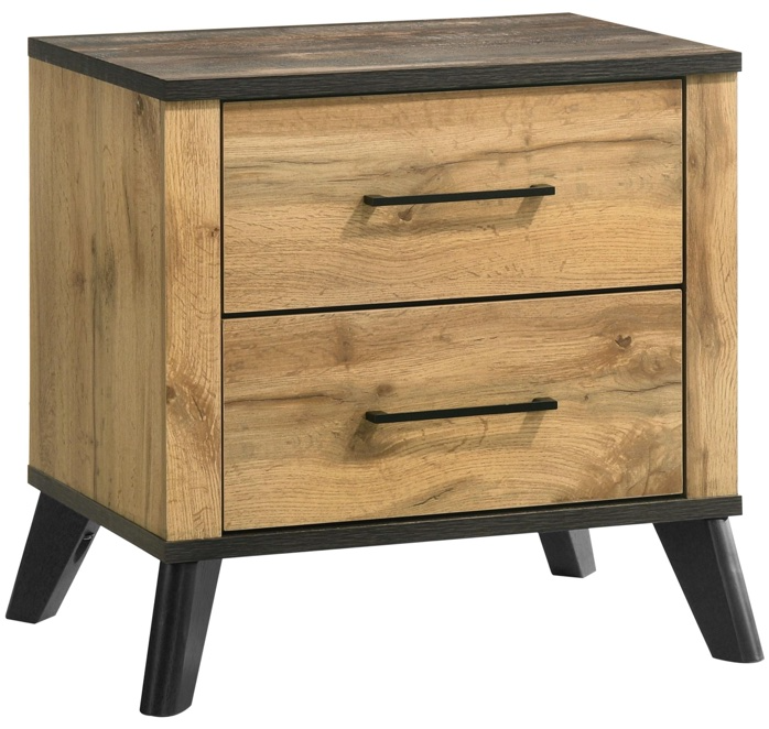 Weathered brown and natural pine finish with matte black metal handles
