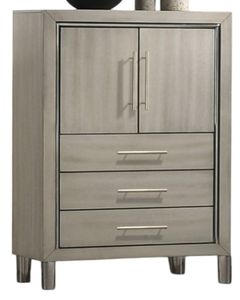 Lustrous Details: The furniture features a specialty metallic finish over wood that mimics the modern, polished look of stainless steel while offering exceptional durability and scratch resistance. It enhances the light gray finish, adding a sleek, sophisticated touch ideal for a contemporary ambiance.