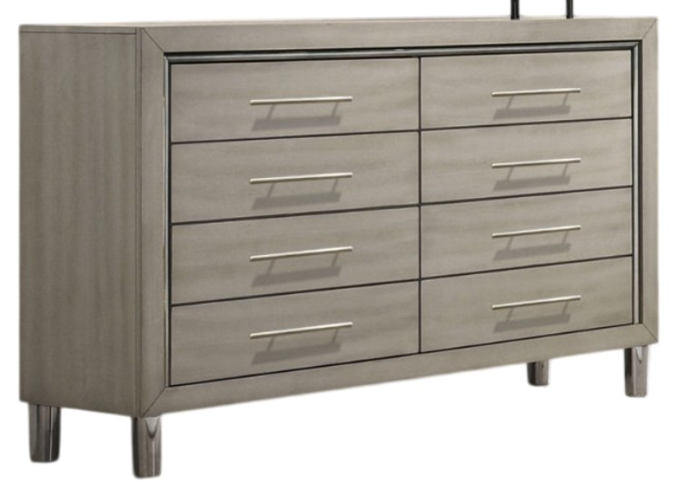 Lustrous Details: The furniture features a specialty metallic finish over wood that mimics the modern, polished look of stainless steel while offering exceptional durability and scratch resistance. It enhances the light gray finish, adding a sleek, sophisticated touch ideal for a contemporary ambiance.