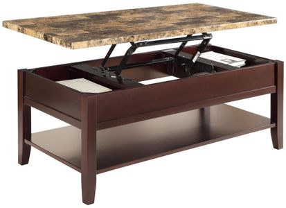 Creatively designed to meet the needs of your casual living room is the Orton Collection. The faux marble tabletop is complemented by a rich cherry finish that covers the cocktail table’s box-framed apron and legs. The cocktail table features a display shelf and a convenient lift tabletop that makes this functional group a welcome addition to your home. Coordinating end table is also available.Read More