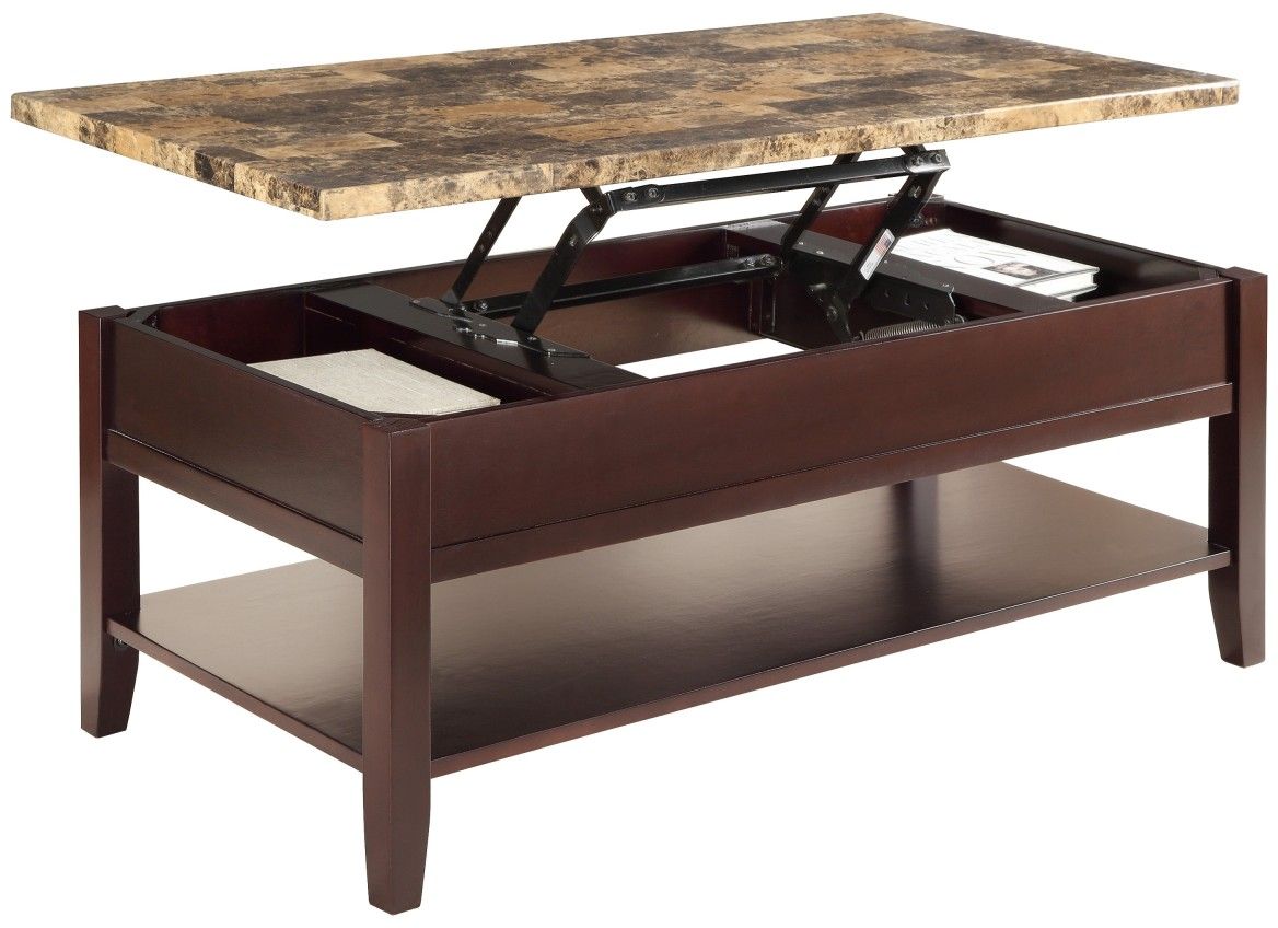 Creatively designed to meet the needs of your casual living room is the Orton Collection. The faux marble tabletop is complemented by a rich cherry finish that covers the cocktail table’s box-framed apron and legs. The cocktail table features a display shelf and a convenient lift tabletop that makes this functional group a welcome addition to your home. Coordinating end table is also available.Read More
