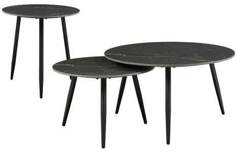 Creatively designed to complement your modern living room, the Alaina Collection’s streamlined profile pairs three occasional tables for a cohesive presentation. Conveniently packaged together, the nesting round cocktail tables and round end table feature black marble-inspired sintered stone tops and black finished metal legs.Read More
