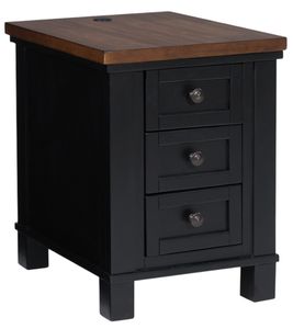 Raise the bar on modern farmhouse style with the Rustiq chairside end table. Its sturdy silhouette and casual good looks are accentuated with a two-tone finish, which pairs a warm satin black base with a contrasting butcher block veneer top. Spacious storage drawers and dual USB charging ports keep devices powered up and close at handRead More