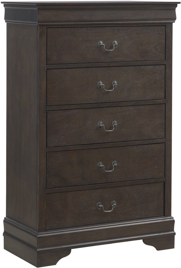 Polished and poised in an elegant deep brown finish, this chest of drawers is a regal dream. Five dovetail constructed drawers provide sophisticated storage. An additional elegant touch is made by the antiqued bronze-tone drawer pulls.Read More