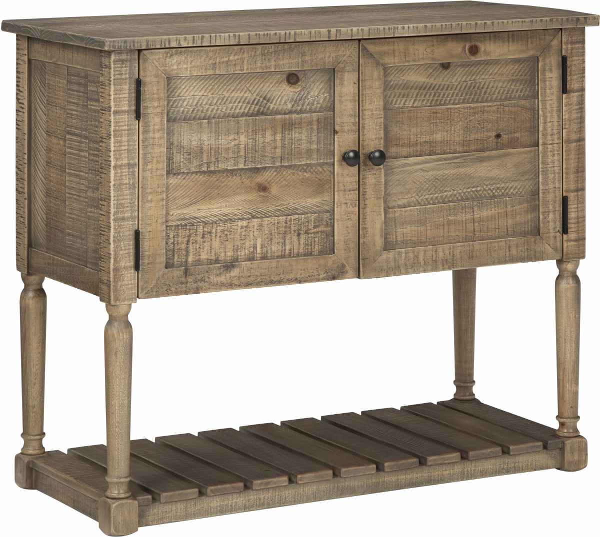 Storage and style are made easy with this accent cabinet. The plank door front and open air storage shelf bring a natural look, while pewter finished hardware adds an industrial touch. In an antiqued brown finish, this accent cabinet offers endless possibilities.Read More
