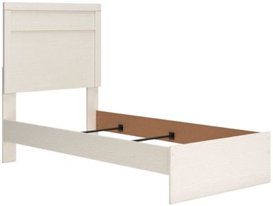 With its clean-lined look and modern attitude, this panel bed is a fresh style awakening. A crisp, white hue over subtle replicated wood grain easily complements other furniture finishes. Its simple, unadorned profile is given depth and dimension with the addition of plank-style molding on the headboard.Read More