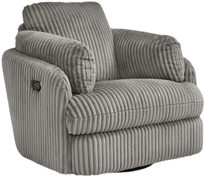 Like a warm hug, this recliner envelops you in comfort with its barrel shape and soft cord upholstery. It reclines, glides, and swivels to cater to your every need. This chair also features posh bolster pillows and cleverly designed storage. Unwind and cuddle up in your new cozy place.Read More