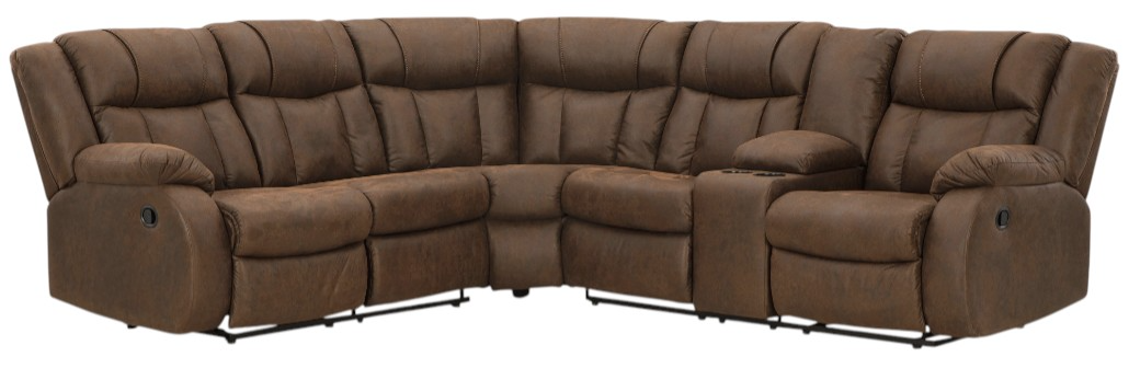 Melt into comfort at the end of your day. Accented by jumbo stitching, the supple walnut faux leather and sumptuous cushioning cradle your body in infinite positions of leisure. Simply pull the tab to recline. With dual cup holders and convenient console storage, this reclining sectional makes relaxation your sweet reward for all you do.Read More