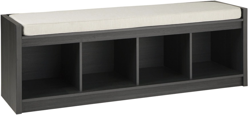 The clean profile of this long storage bench makes an entrance anywhere and everywhere you place it. Dark gray replicated wood grain finish adds striking style. Wrapped in light gray fabric, the reversible seat provides foam-cushioned comfort. Four open storage compartments add function to form in this must-have piece for large spaces.Read More