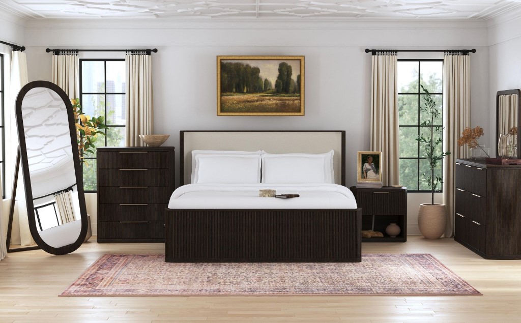 Bedroom set includes: (1) bed (headboard, footboard, and rails), (1) dresser, (1) mirror, and (1) nightstand only, all other products sold separately. Images may not reflect actual size. Color in images may differ in person; see store for actual finish