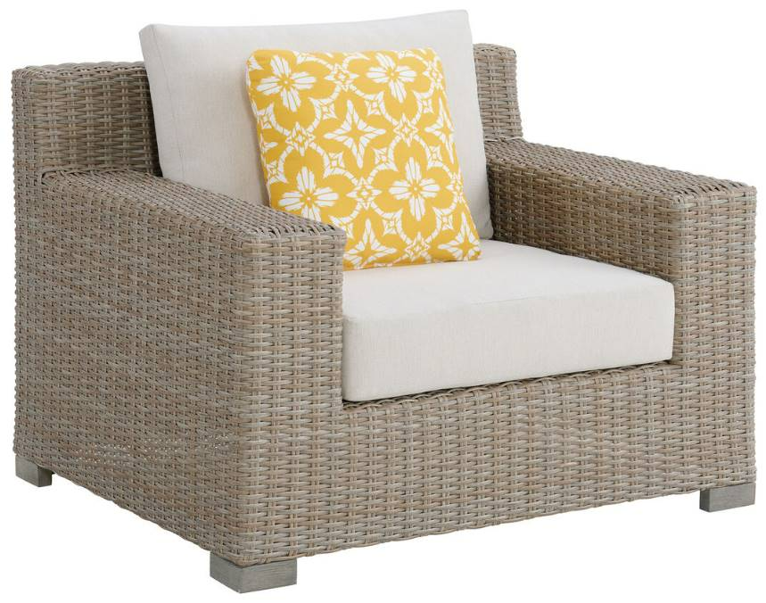 The Tan outdoor chair has a comfortable design with cream fabric and tan accents. The vibrant yellow pillows will give your backyard a little pop of color making your space more invitingRead More