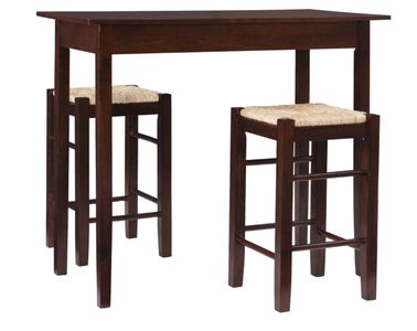 Maximize small spaces with this 3-piece counter set. The rectangular table stands on sturdy, streamlined legs, paired with two backless counter-height stools featuring classic rush seats.Read More