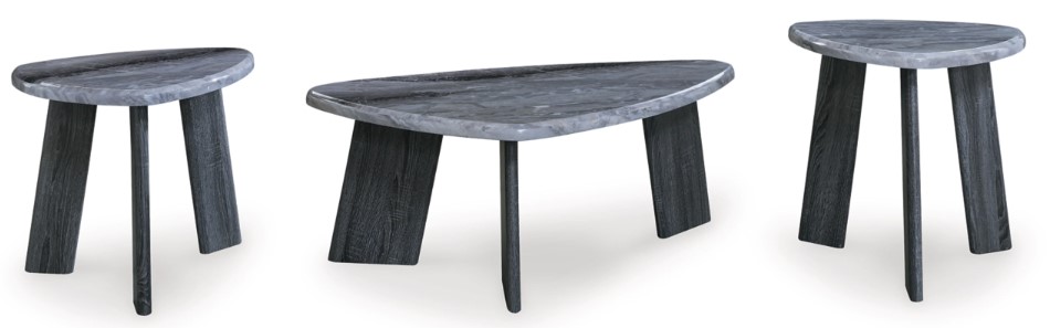 Two-tone finish consisting of faux gray marble tops and weathered gray wood grain legs.